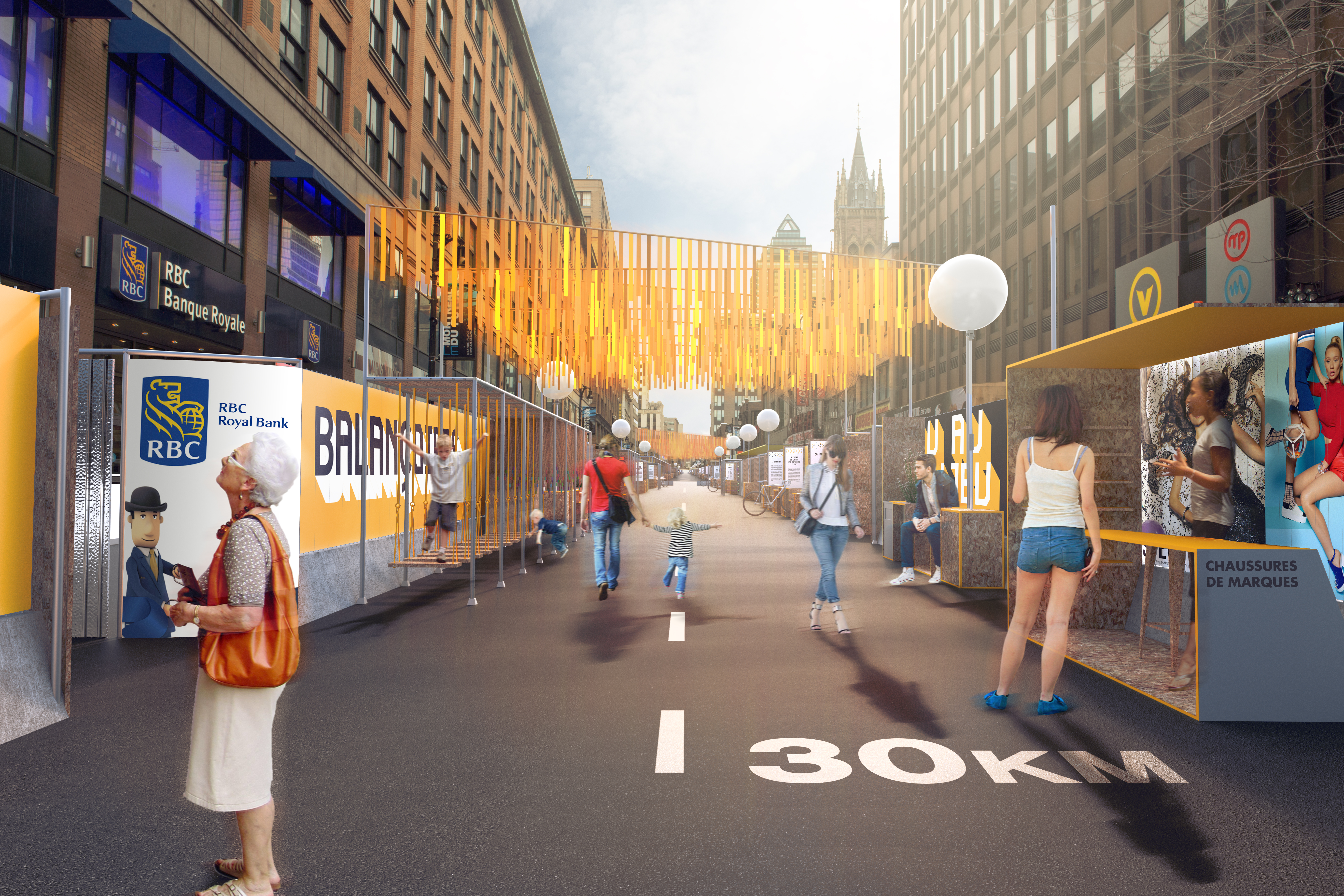 A design competition to reduce the impact of public works on Sainte-Catherine Street West by enhancing the work site: develop creative and innovative ideas that can reduce disruptions in the daily lives of retail merchants, residents, workers and tourists.