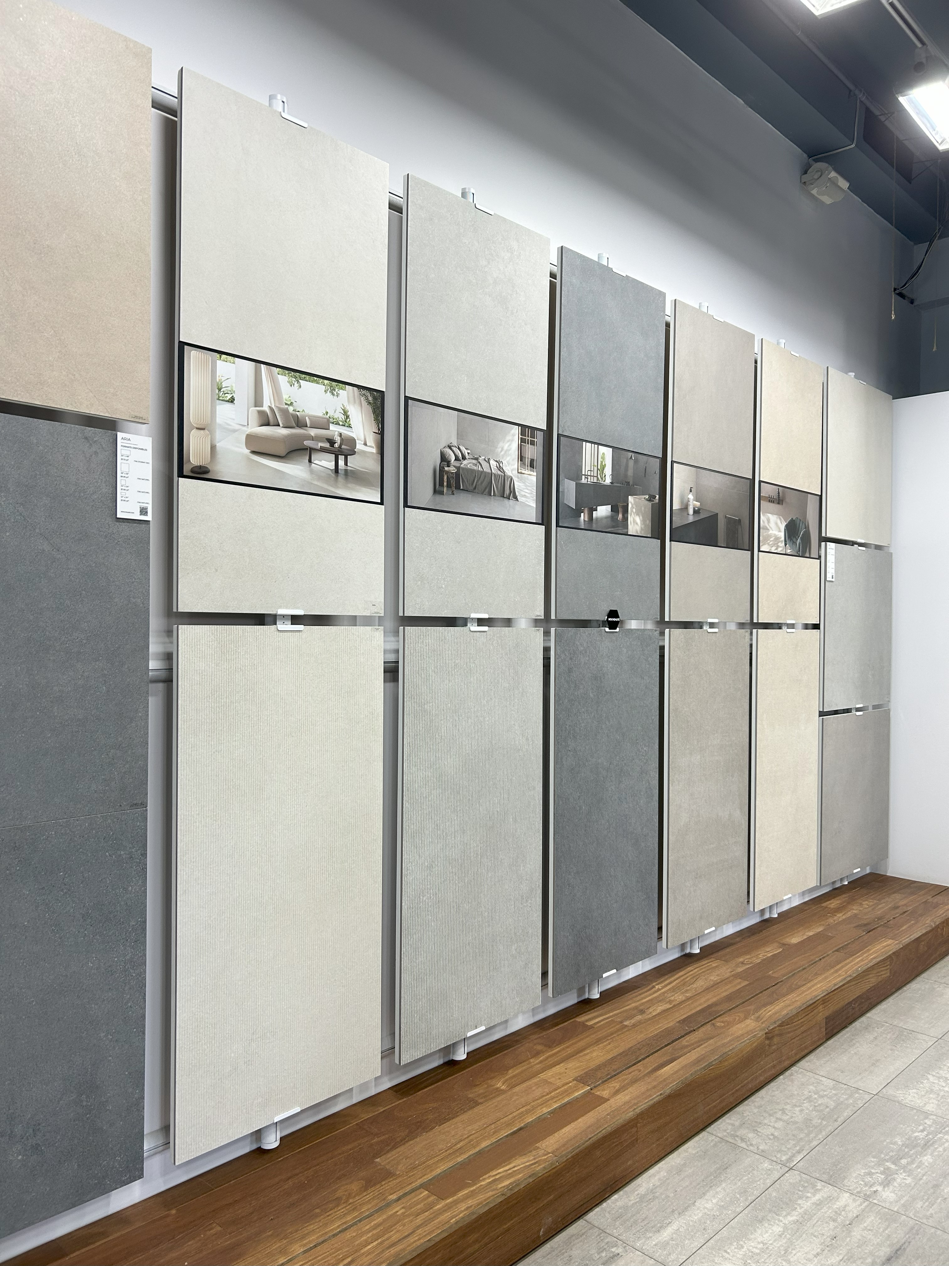 To echo the original look and feel, we selected large-scale ceramic tiles with a subtle vertical texture to recall the warmth and rhythm of wood slats. Brand colors were introduced through soft blue accents—in the staff kitchen and as a custom gradient wallpaper in the children’s area—lending continuity, comfort, and a touch of playfulness.